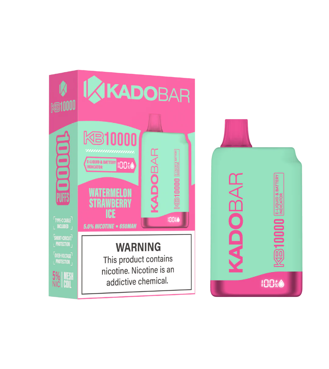 The Kado Bar KB10000 Puff Disposable is a new disposable from one of the vaping industry’s most recognizable and prominent companies. The Kado Bar KB10000 is a compact, discreet, rechargeable mesh coil vape with cool tastes. Featuring a contemporary design that shows Kado’s attention to detail, an E-Liquid and Battery Indicator, and a mesh coil engineered to produce tasty vapor with a rich body while maximizing device efficiency. Watermelon Strawberry Ice Kado Bar